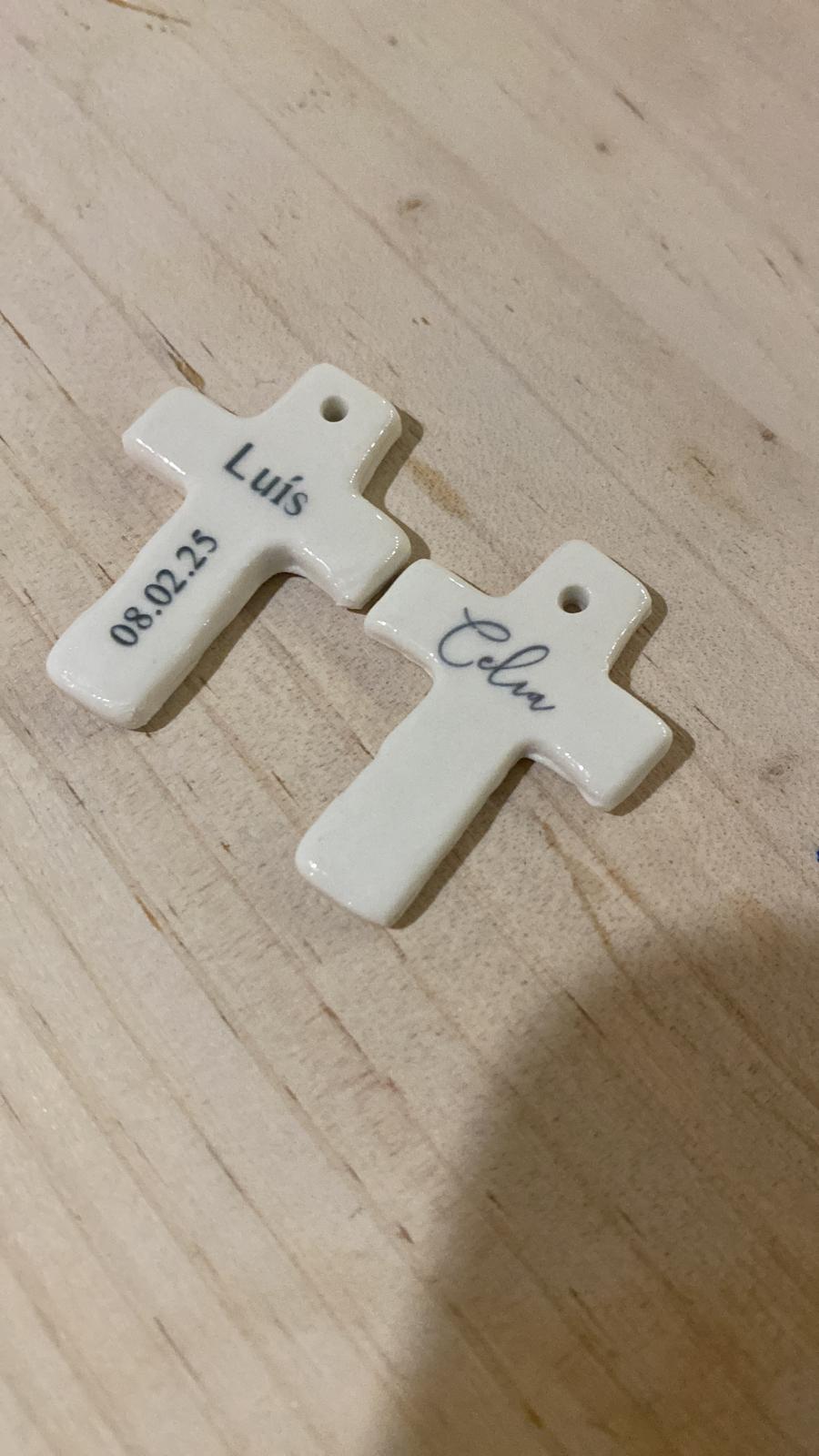 Nuestra Cruz de Porcelana Blanca natural está compuesta por una cruz de porcelana personalizada a la cual puedes añadir el Nombre y Fecha del bautizo, comunión o cualquier evento. La personalización la hacemos en calca cerámica para mantener la misma tipografía en todas las cruces.